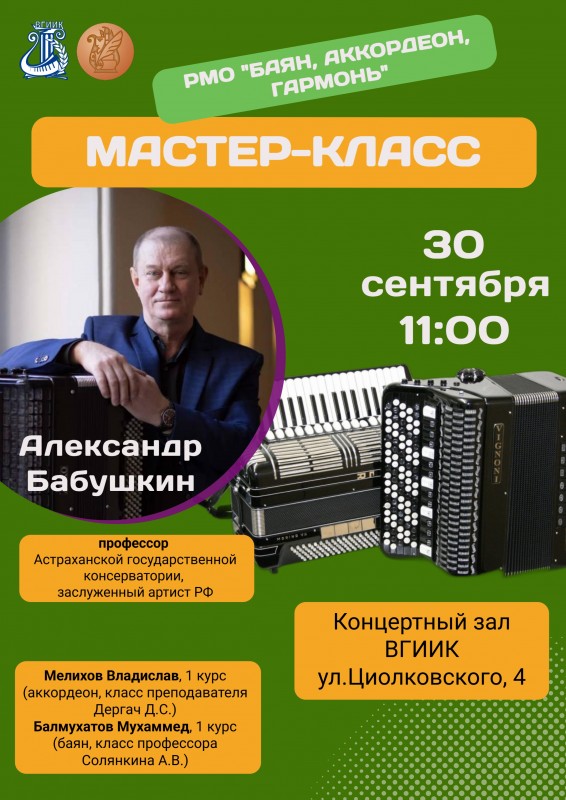 30 сентября 2025 года в Волгоградском государственном институте искусств и культуры (ВГИИК) в рамках реализации регионального проекта «Региональные методические объединения» по направлению «Баян, аккордеон, гармонь» прошел мастер-класс заслуженного артиста России, профессора Астраханской государственной консерватории Александра Сергеевича Бабушкина.
