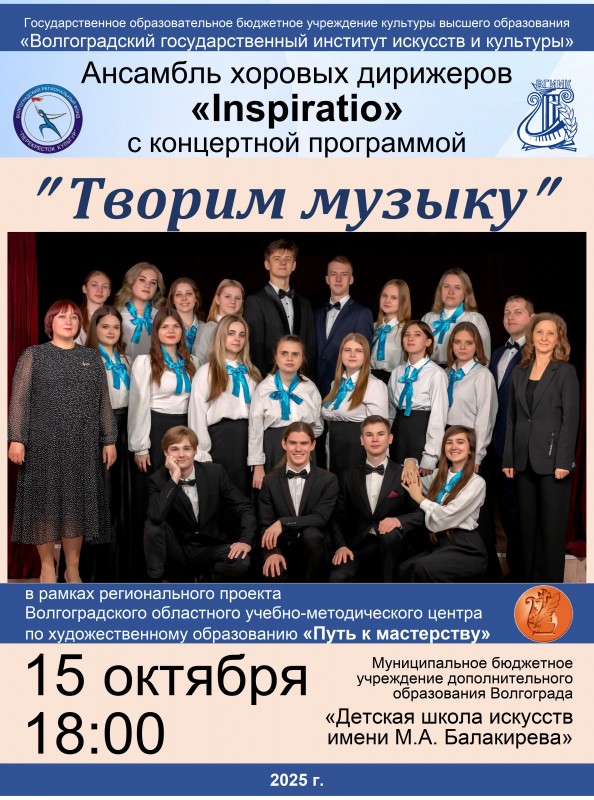 Каким должен быть хоровой дирижер, - что он умеет и чем отличается от обычного музыканта, - расскажут и продемонстрируют свои умения студенты Волгоградского государственного института искусств и культуры: 15 октября в 18:00 МБУ ДО Волгограда «Детская школа искусств имени М. А. Балакирева» в рамках регионального проекта Волгоградского областного учебно-методического центра по художественному образованию «Путь к мастерству» артисты Ансамбля хоровых дирижеров «Inspiratio» представят юным зрителям и гостям концертную программу под привлекательным названием «Творим музыку!». В музыкальной части проекта прозвучат различные по жанрам и стилям вокально-хоровые произведения, исполнением которых будут управлять сами студенты – будущие хоровые дирижеры.