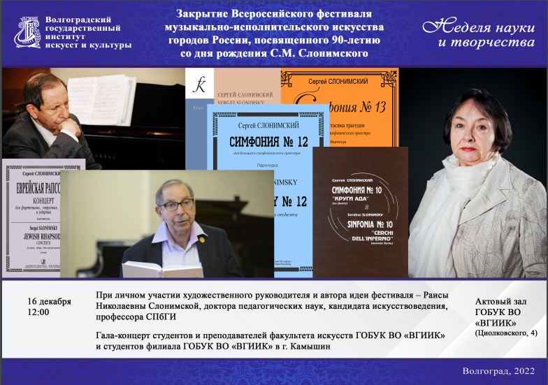 Текущий год для С.М. Слонимского – юбилейный. В 2022 году музыкальная элита отмечает 90-летию со дня рождения композитора. По всей стране идут многочисленные мероприятия, на которых звучит музыка Мастера, проходят конкурсы, конференции, творческие встречи. Дань выдающемуся композитору современности отдали и в вузе искусств и культуры г. Волгограда. На стыке двух тенденций – активного развития фестивальной культуры в России и свободного состязательства в рамках профессионального академического мастерства – возникла идея проведения Всероссийского фестиваля музыкально-исполнительского искусства городов России, посвященного 90-летию со дня рождения С.М. Слонимского. Идея была горячо поддержана музыковедом, президентом Международного центра современной классической музыки им. С. М. Слонимского, доктором педагогических наук, профессором СПбГИК Раисой Николаевной Слонимской, которая стала идейным вдохновителем Фестиваля и приняла в его подготовке и проведении самое живое участие.