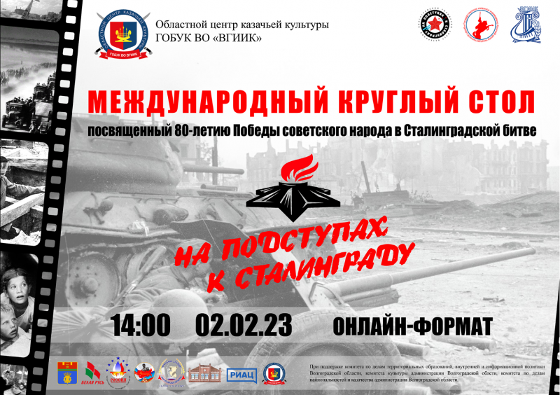 02.02.2023 года Областной центр казачьей культуры ВГИИК в 10 часов открывает виртуальный кинозал https://www.twitch.tv/ockk34 , а в 14 часов организует Международный круглый стол «На подступах к Сталинграду», посвященный 80-летию Победы в Сталинградской битве. Мероприятие пройдет на платформе Zoom для широкой аудитории слушателей, в том числе для детей и молодежи. В работе круглого стола примут участие представители учреждений образования, научной и творческой интеллигенции, а также ветеранские и общественные организации Волгограда, Волгоградской, Ростовской, Астраханской, Саратовской, Оренбургской, Омской областей, Республик Северного Кавказа, Донецкой народной республики, Республики Казахстан, Республики Беларусь. Принять участие в мероприятии можно по ссылке, которая направляется в ответ на регистрацию по электронному адресу Elena54720411@mail.ru
