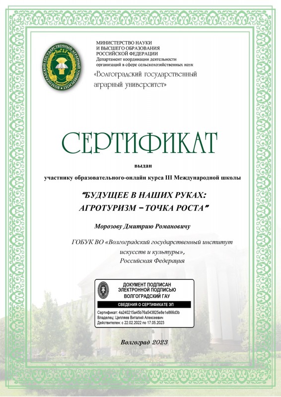 Студенты кафедры социально-культурной деятельности ВГИИК приняли участие в Международном конкурсе турмаршрутов «Путешествие по сельским территориям» в рамкахIIIМеждународнойшколы «Будущее в наших руках: Агротуризм – точка роста», который проходил с 15 по 24 марта 2023 г. в Волгоградском Аграрном государственном университете. Целью конкурса была популяризация сельской жизни и сельского гостеприимства, раскрытие в турмаршрутах самобытной красоты гостеприимства, любви к традициям и национальной истории России, привлечение молодых специалистов в сельские территории, возрождение и пропаганда традиционных этнокультурных, семейных ценностей, сельского образа жизни.