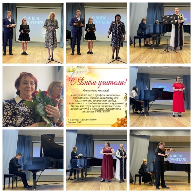 6 октября в Волгоградском институте искусств и культуры состоялся праздничный концерт, посвященный Дню учителя. Педагогов ВГИИК поздравили: начальник отдела по работе с социально ориентированными некоммерческими организациями комитета культуры Волгоградской области Наталья Кончагаровна Хайруш, которая вручила преподавателям ВГИИК Почетные грамоты Губернатора Волгоградской области, и исполняющая обязанности ректора Волгоградского института искусств и культуры, доктор искусствоведения, профессор Оксана Игоревна Луконина. Открылся концерт трогательным поздравлением с видеороликом от кафедры режиссуры в адрес юбиляра - доцента кафедры режиссуры Надежды Георгиевны Мерлиной. Музыкальный подарок Надежде Георгиевне преподнесли Виктория Николаевна Мерлина и Виктория Павленко, исполнив песню В. Мигули «Поговори со мною, мама». Прозвучали поздравления в честь дня рождения и в адрес Галины Сергеевны Андроновой профессора кафедры режиссуры ВГИИК, заслуженного работника культуры Российской Федерации.