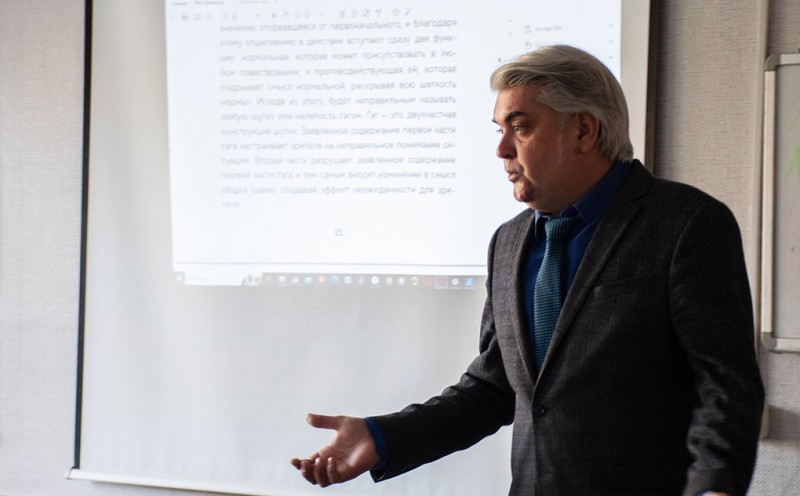 На мастер-классе «Гэги в кино. Как прописывать шутки в сценарии для игровых и анимационных фильмов» преподаватель кафедры режиссуры Анатолий Петрович Беляевсков рассказал о том, что такое гэг и чем он отличается от каламбуров и других видов шуток, о его формах и видах, о художественных приемах, которые можно использовать при написании гэгов в сценарии, и, главное, о том, как их придумывать.