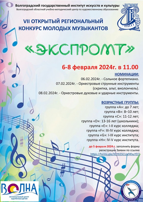 С 6 по 8 февраля в Волгоградском государственном институте искусств и культуры прошёл VII Открытый региональный конкурс молодых музыкантов «Экспромт», участниками которого стали 183 молодых музыканта со всего Южного Федерального округа Российской Федерации, среди них - обучающихся детских музыкальных школ, детских школ искусств, студенты колледжей, институтов искусств и культуры.