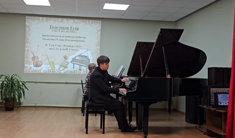 Студент первого курса колледжа кафедры фортепиано ВГИИК Егор Толстиков стал лауреатом I премии Областного конкурса “CONCERTO GROSSO” молодых музыкантов отделений музыкального исполнительства среди учащихся ДМШ и ДШИ, студентов сузов и вузов, который прошел в Городищенской школе искусств 26 апреля. В конкурсной программе Егор Толстиков исполнил концерт для фортепиано с оркестром К. Сен-Санса №2, 1 часть. Партию оркестра исполнила преподаватель Егора – лауреат международных конкурсов Елена Владимировна Падилова. Этой победой наш студент продолжил свой успешный путь на конкурсах пианистов. В апреле он стал лауреатом международного конкурса – фестиваля музыкального исполнительства имени Сергея Михайловича Слонимского (который проходил 4 и 5 апреля 2025 года) и VII Южно-Российского открытого конкурса пианистов – студентов музыкальных колледжей, который проходил в Ростовской Государственной Консерватории им. С. В. Рахманинова с 6 по 12 апреля 2025 года.