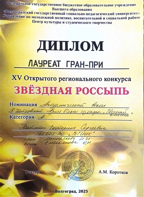 Студентка класса профессора Мещеряковой Н. И. Найман Екатерина стала обладателем Гран-при, исполнив арию Ольги из оперы П. Чайковского «Евгений Онегин».