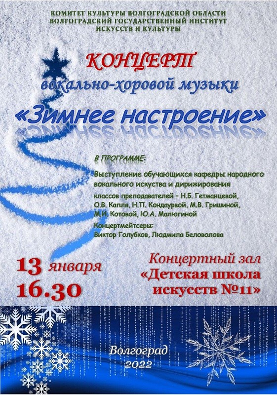 13 января 2022 года в Детской школе искусств №11 г. Волгограда состоится концерт кафедры народного вокального искусства и дирижирования Волгоградского института искусств и культуры.