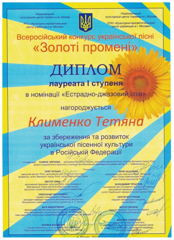 Татьяна Клименко стала лауреатом I степени в номинации «Эстрадно-джазовое пение». Вокальное мастерство конкурсантов оценивало жюри, состоящее из профессионалов высшего уровня: Заслуженная артистка Украины, заслуженная артистка России, солистка Большого театра России Галина Черноба; народный артист России, заслуженный деятель польской культуры, солист Большого театра, солист Metropoliten Opera Олег Кулько и другие титулованные деятели искусства.