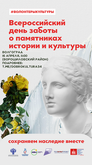 С 15 по 24 апреля во всех регионах страны пройдут масштабные субботники в рамках акции «Всероссийский день заботы о памятниках истории и культуры», где волонтеры будут оказывать помощь в сохранении объектов культурного наследия. Акция приурочена к Международному дню охраны памятников и исторических мест, который отмечается 18 апреля. В преддверии праздника волонтеры культуры ВГИИК примут участие в субботнике, который пройдёт 16 апреля 2022 в Ворошиловском районе города Волгограда, в 11:00. Также перед началом субботника пройдёт лекция об истории ОКН. Лекцию прочитает Олейников Михаил Юрьевич - исполнительный директор АНО «Центр экспертизы и контроля объектов наследия и культурных ценностей».